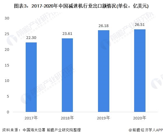 减速机出口供应方面,2017-2020年,我国减速机行业出口额逐渐提高。据海关总署统计数据显示,2020年,我国减速机行业出口总额达26.15亿美元,较2019年进一步增长。