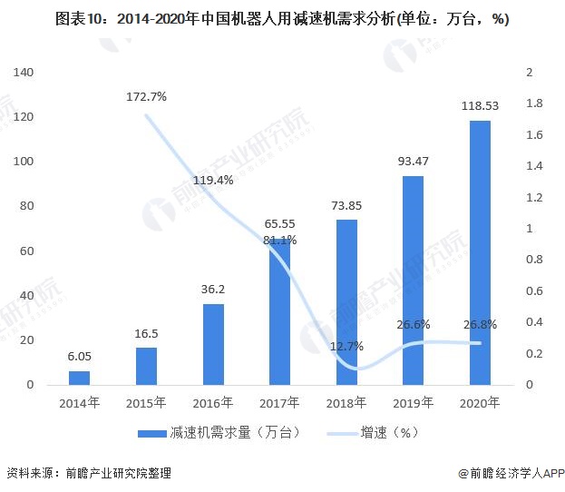 根据前瞻产业研究院的测算,2020年,我国工业机器人用减速机的需求量在120万台左右。